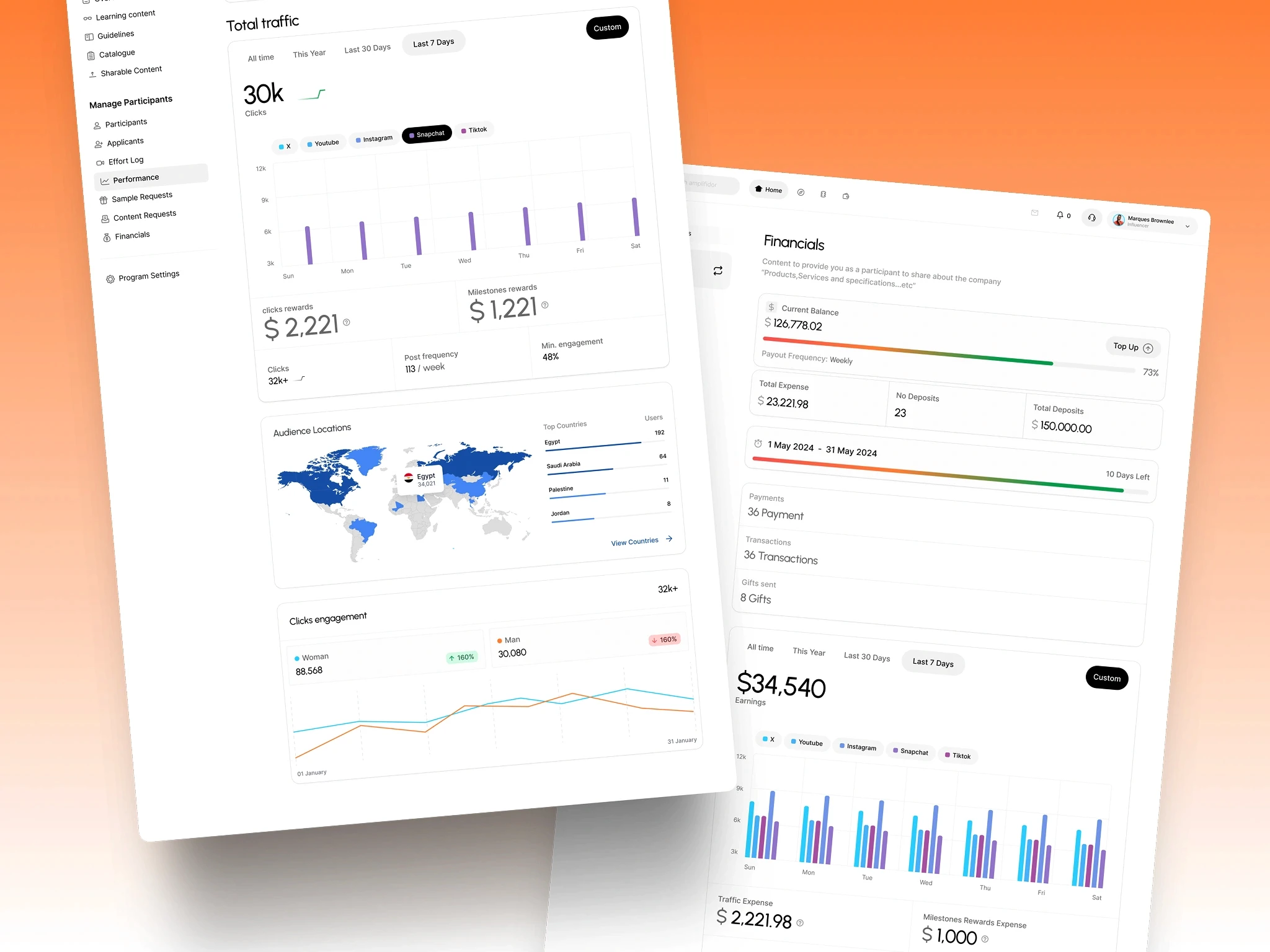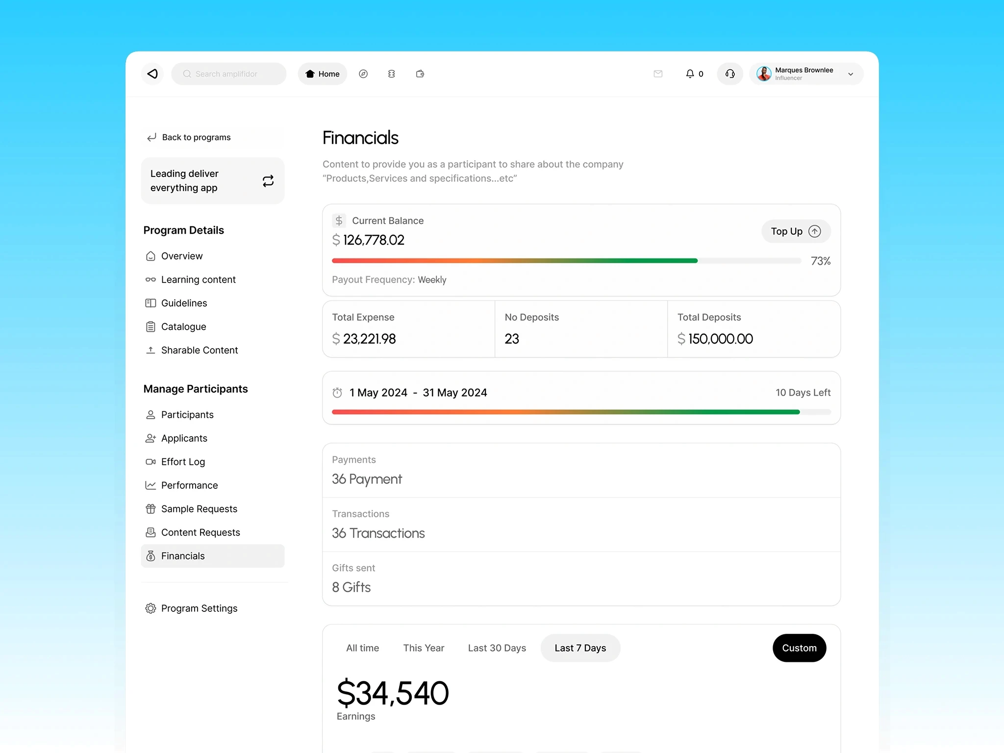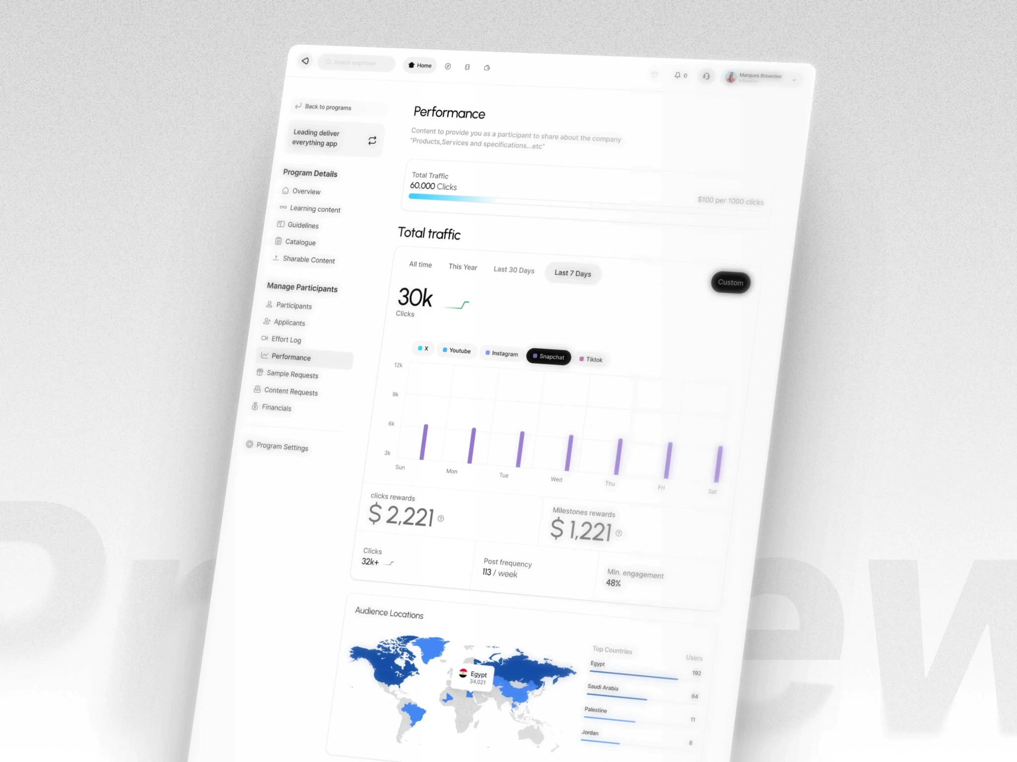 The core execution hub where brands launch "Programs" with clear deliverables. It automates the entire lifecycle, from discovery and application to verification and milestone completion.