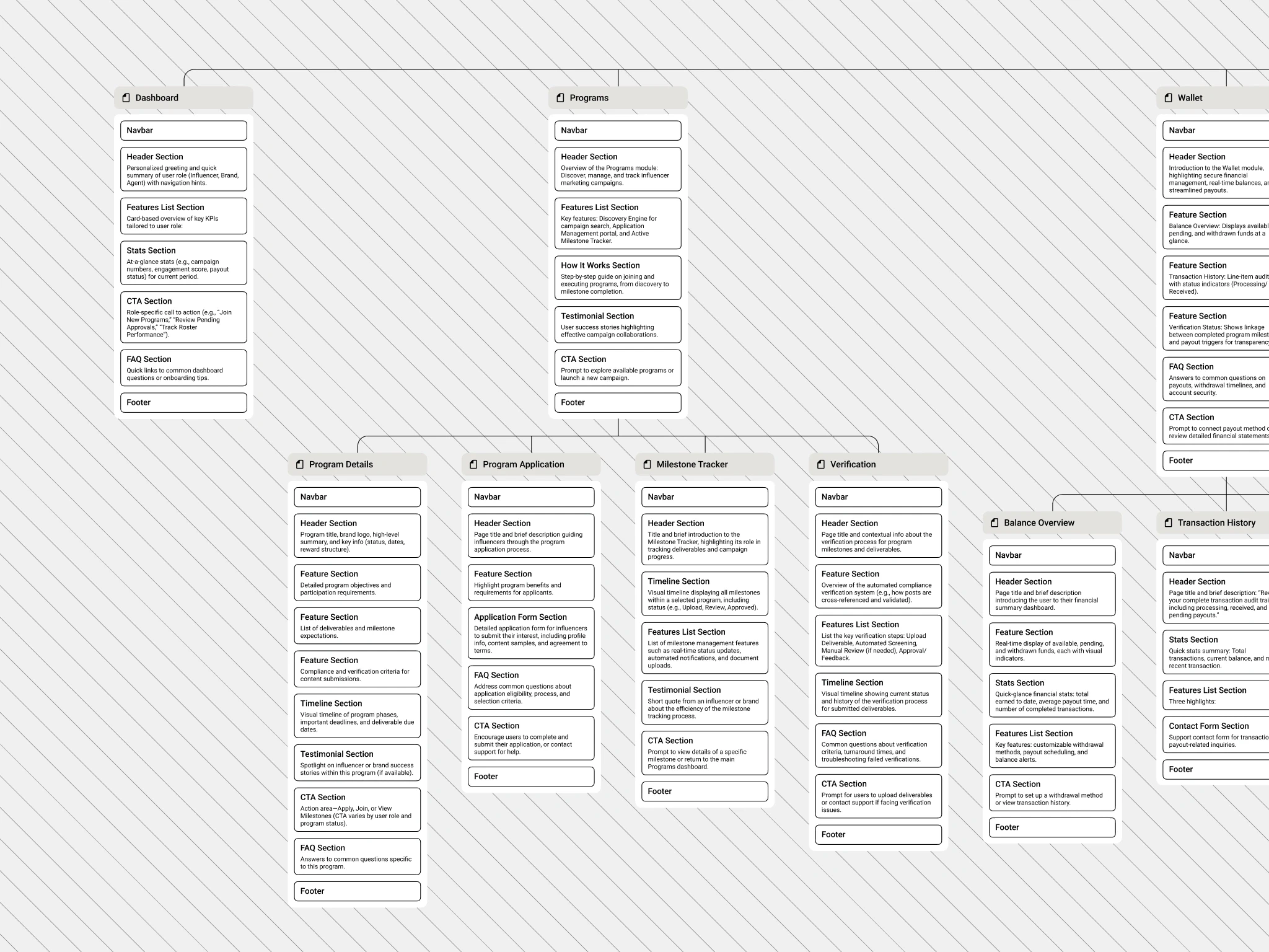 The architecture follows a "hub-and-spoke" model. The centralized hub is the Dashboard, which synchronizes data from Groups, Performance, and the Wallet. This hierarchy ensures that users can move from a high-level overview of their "Total Earnings" directly into granular "Program" details without losing context.