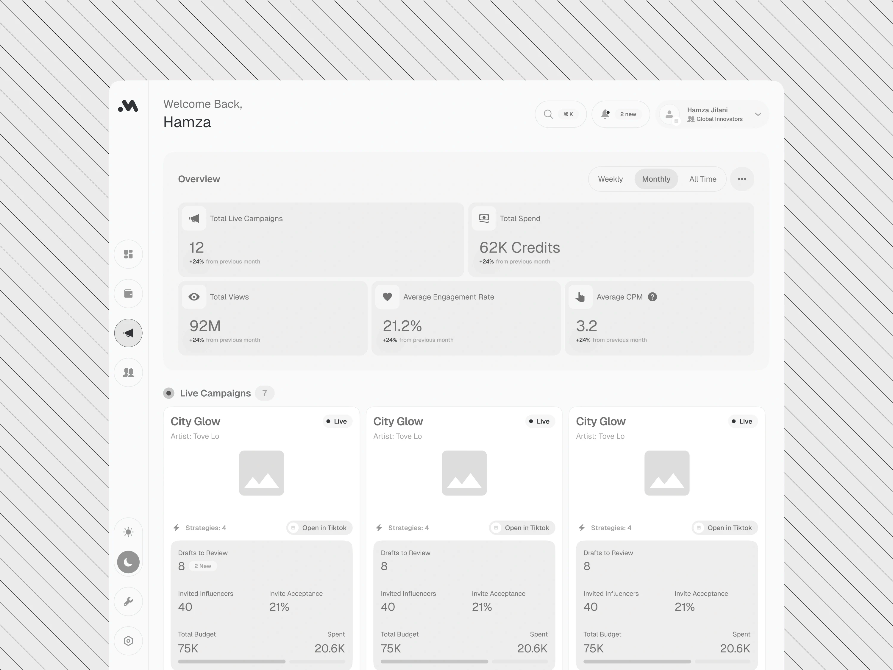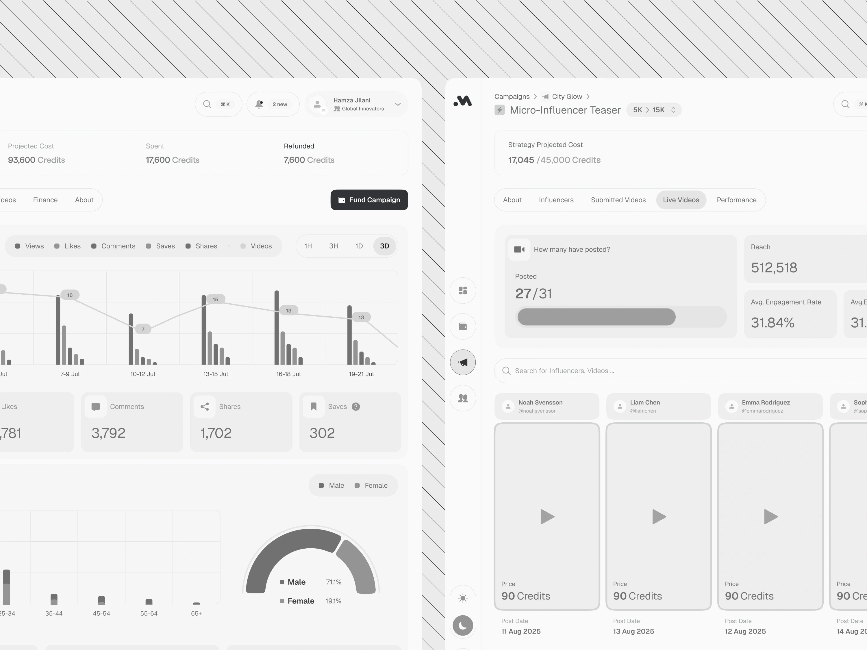The layout organizes complex data into clear, simple blocks so users don't get overwhelmed. By keeping high-level strategy separate from creator tracking, we made it easier to manage both at once. This supports "deep-scanning," allowing managers to spot budget issues or trend changes across dozens of streams at a glance.