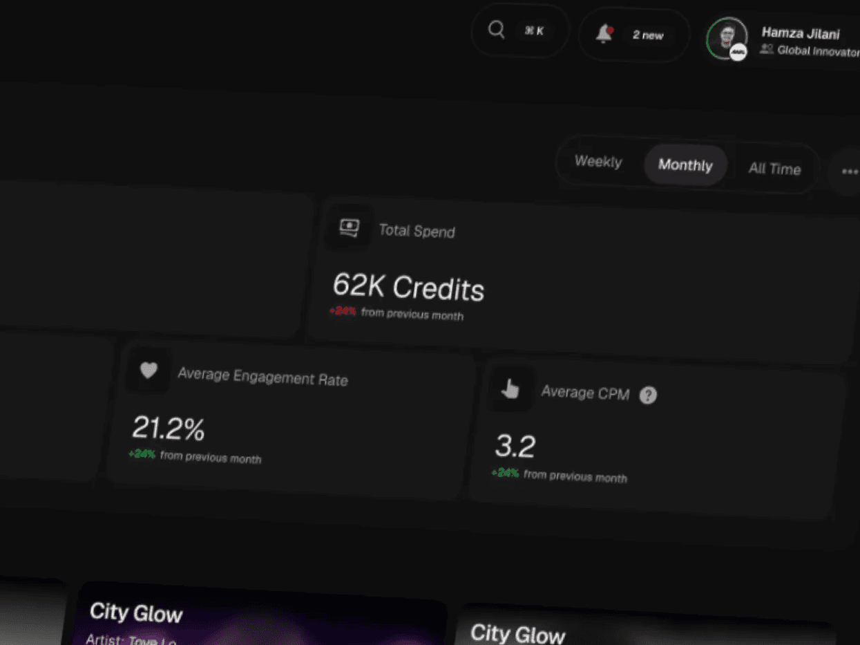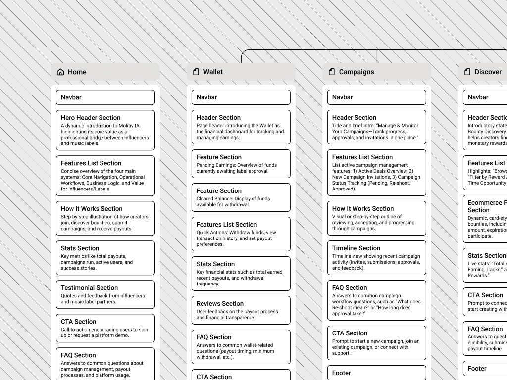 We architected a centralized Label Operations Hub, ensuring deep administrative control without compromising clarity. A "Global Sound State" synchronizes campaign data between the label's web dashboard and real-time creator notifications. The hierarchy is optimized for music marketing workflows.