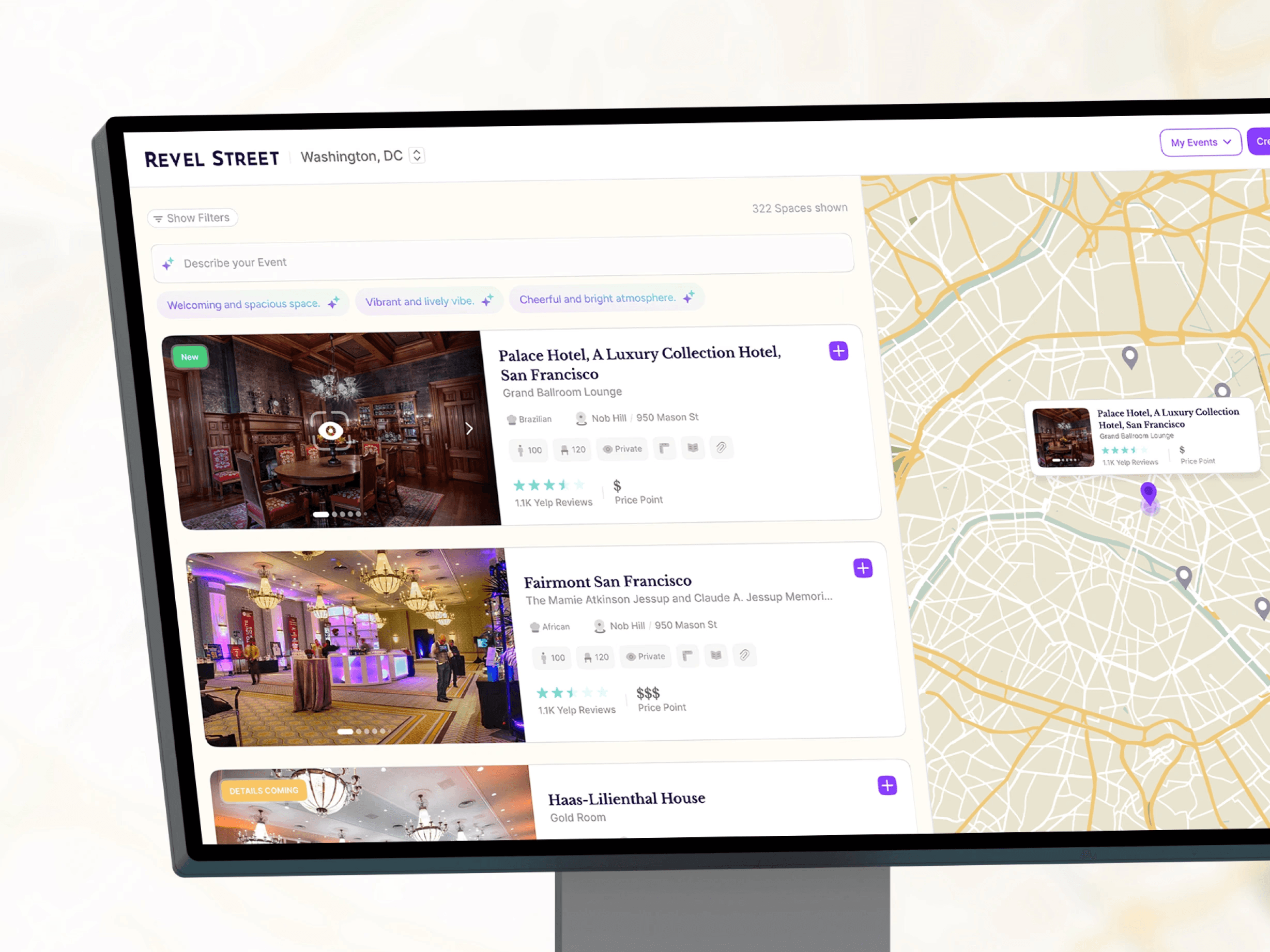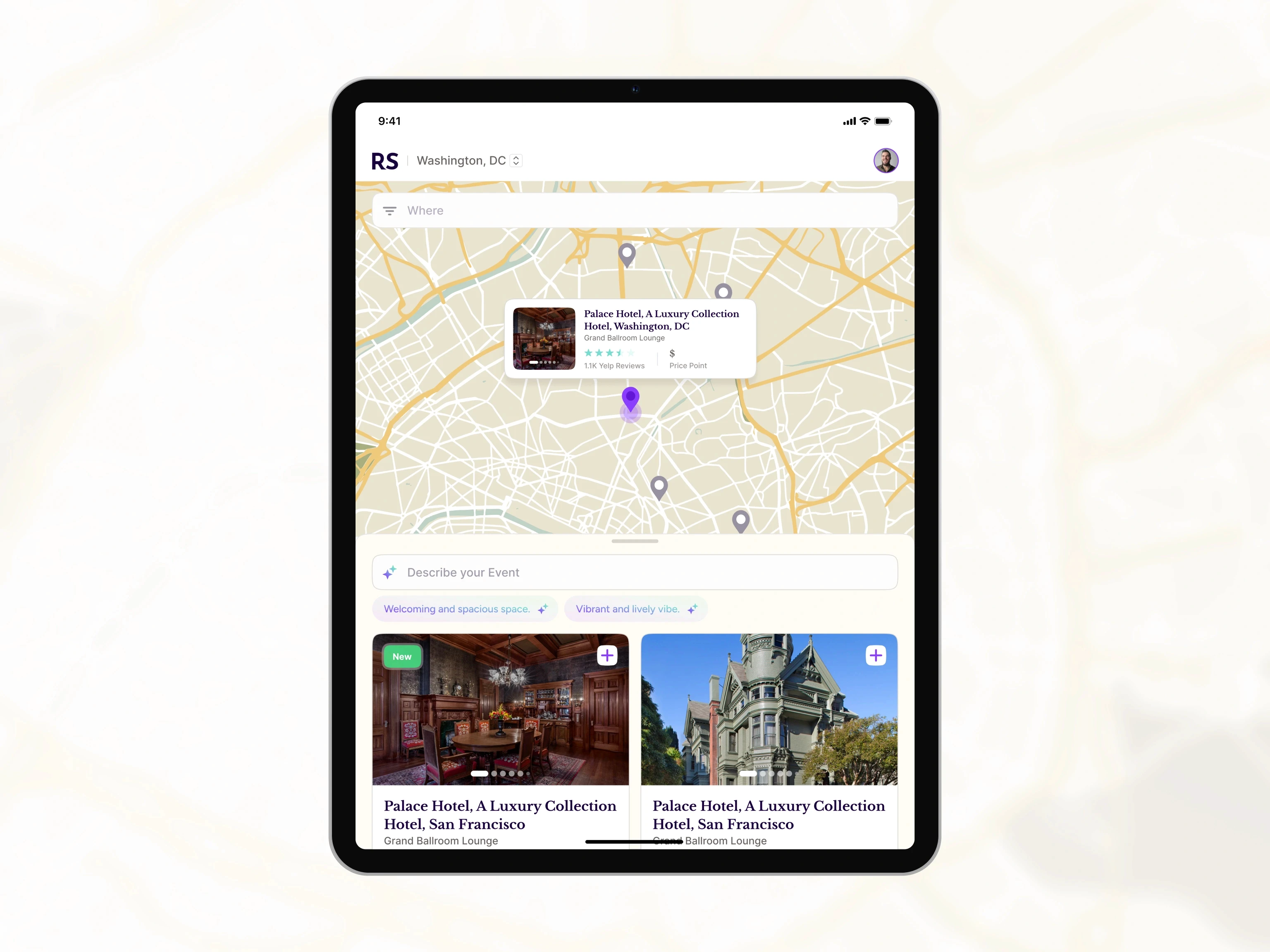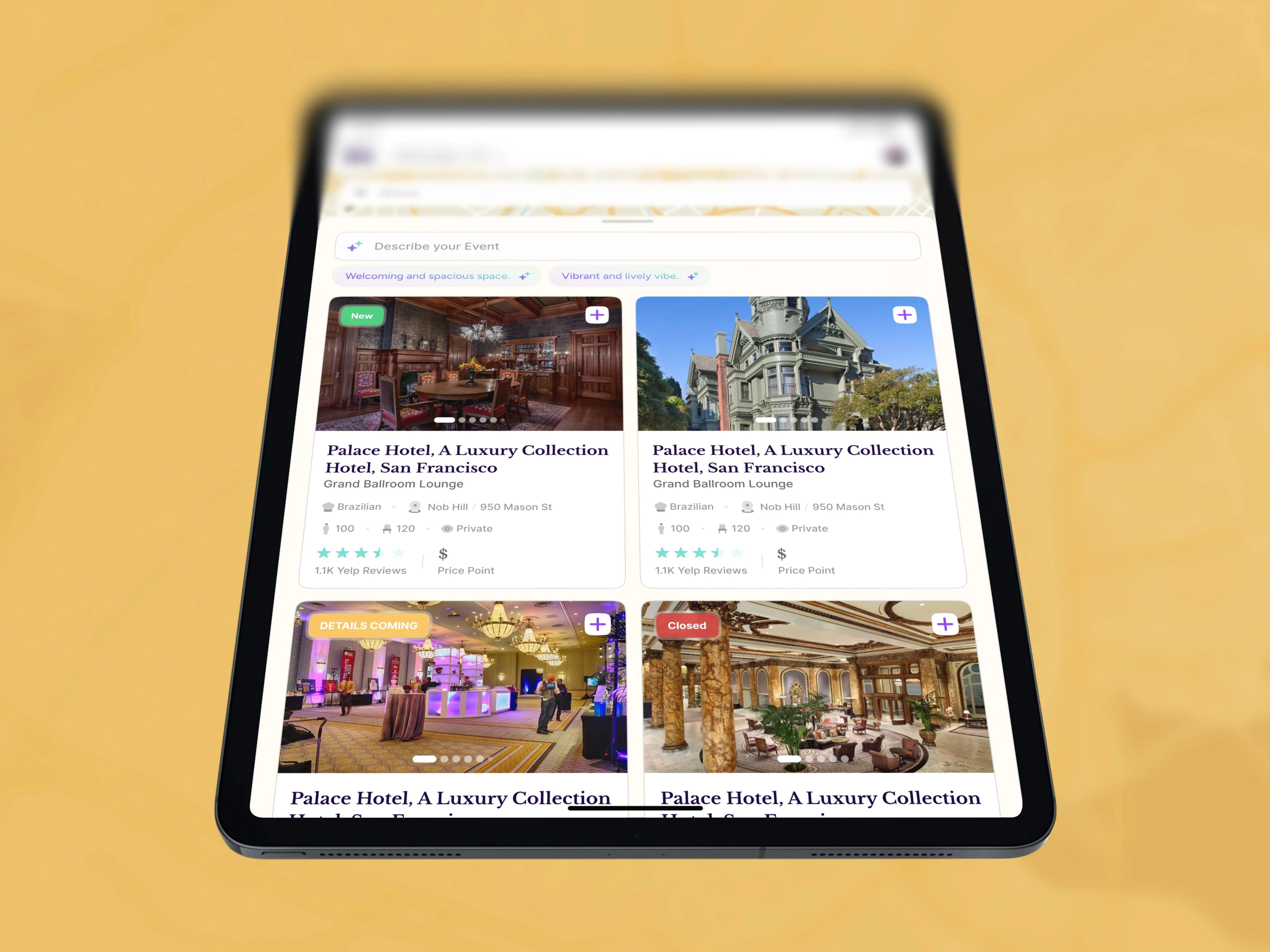 Users can type or speak their requirements naturally. The AI analyzes venue metadata to surface the most relevant matches instantly.