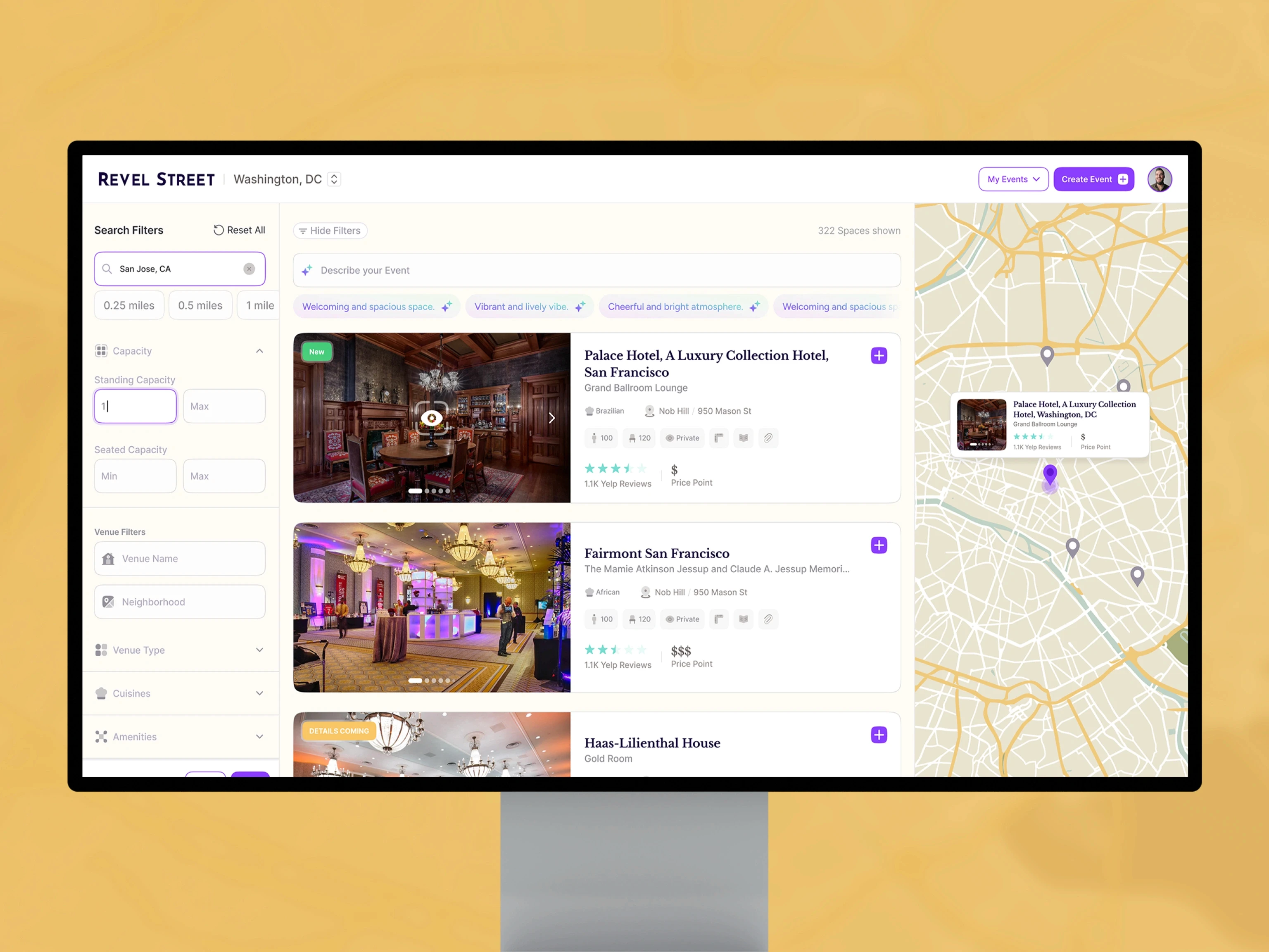 Desktop: Maximizes horizontal space to show filters, maps, and venue cards side-by-side for easy comparison.