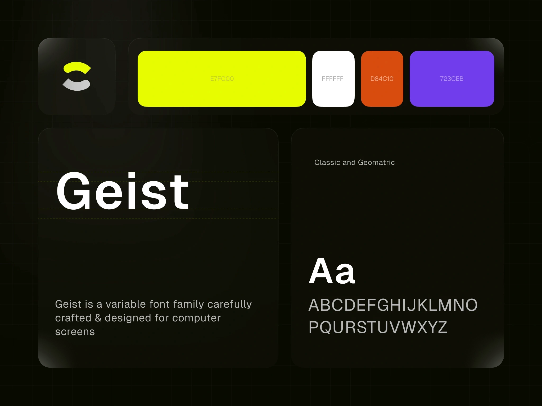 We selected the Geist variable font for its extreme legibility across digital interfaces and its geometric, modern feel. It allows users to scan dense project data without visual fatigue. Our palette: Neon Lime (#E7FC00), Electric Purple (#723CEB), and Burnt Orange (#D84C10), was chosen to reflect energy, precision, and the high-end nature of the subscription model.