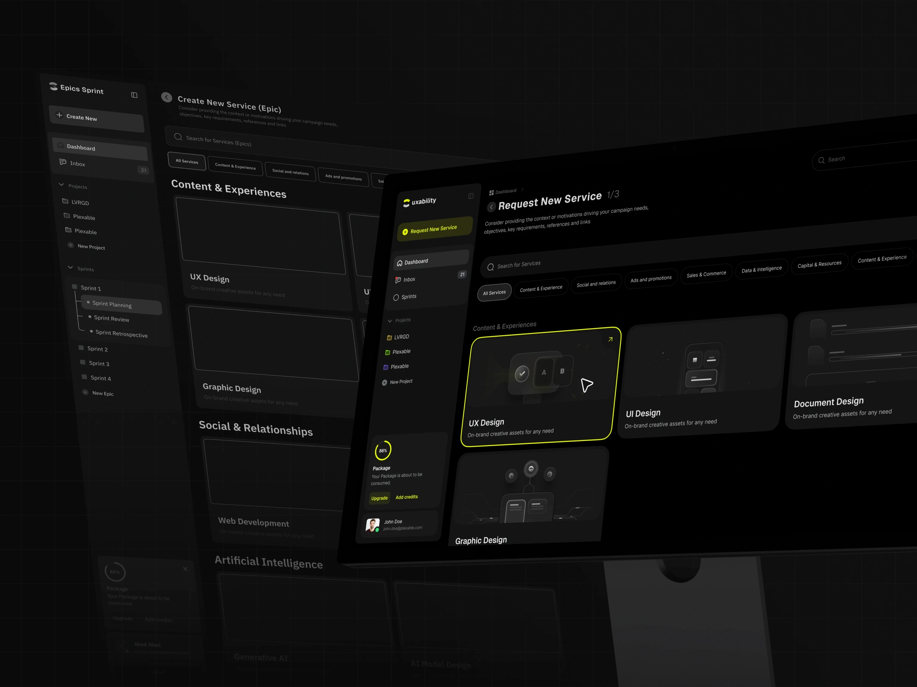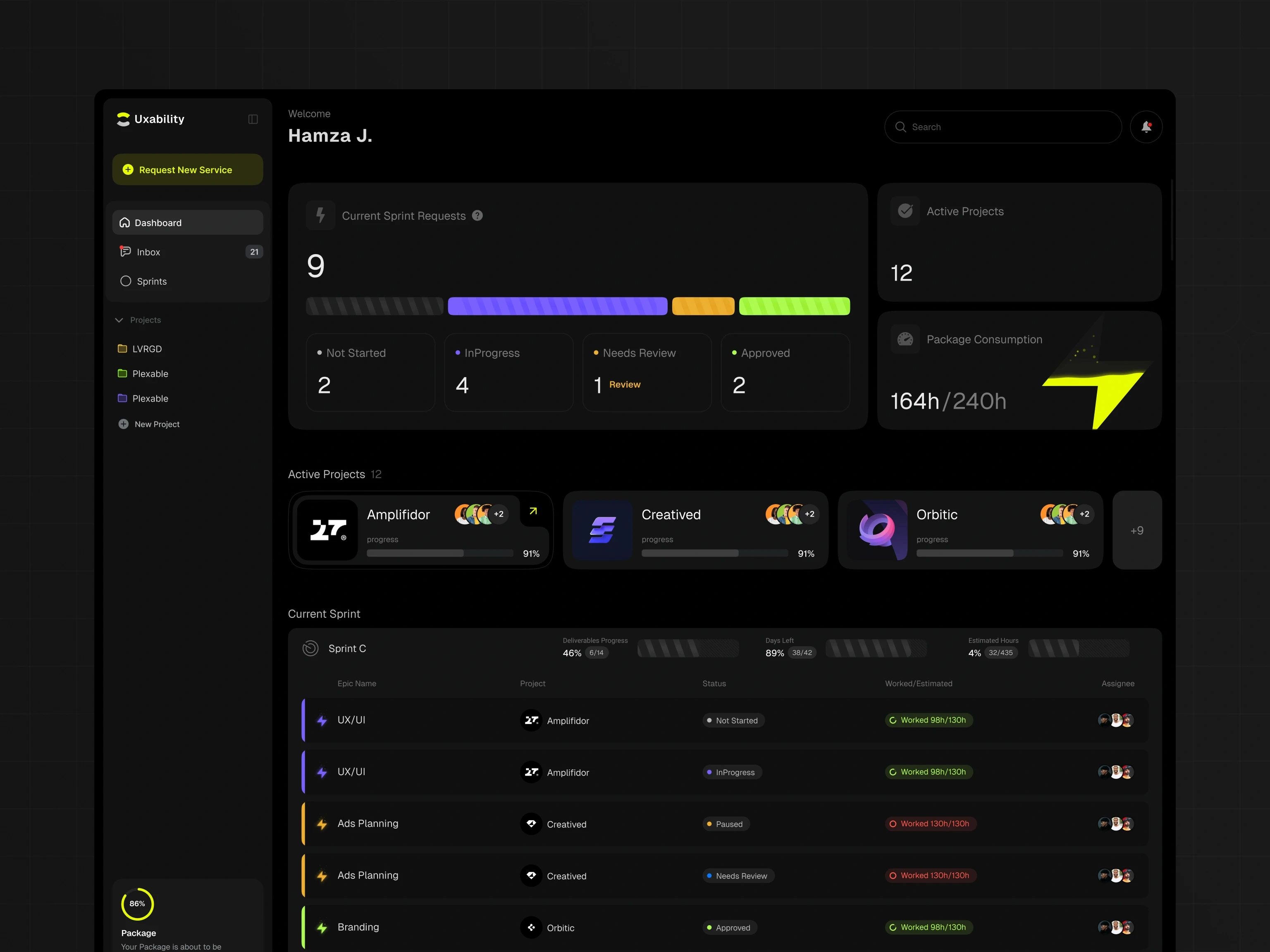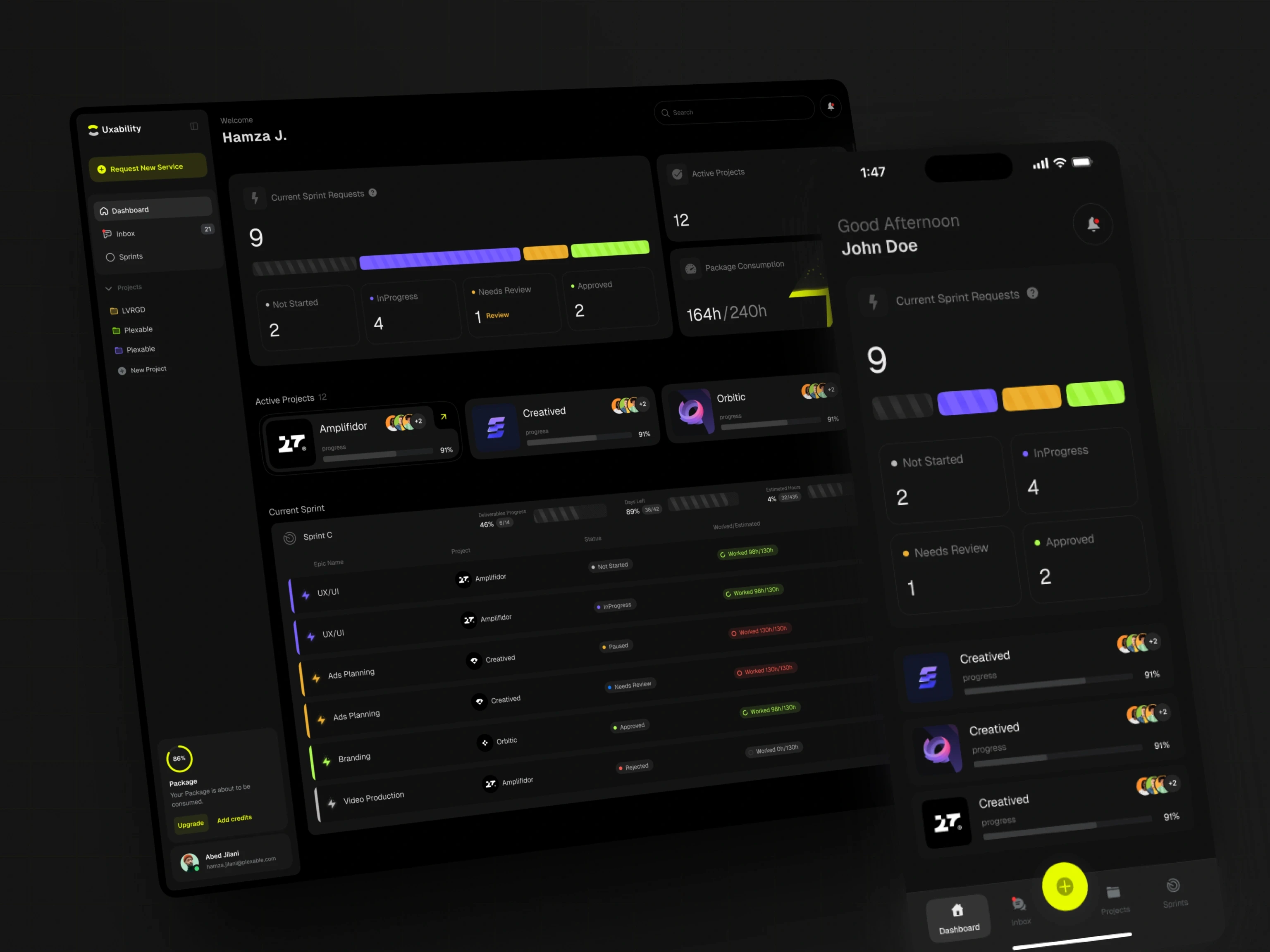 High-contrast "Dark Mode" components ensure focus on active tasks. Clean geometry and vibrant accents reflect the "Productized Service" identity crucial for the Uxability experience.