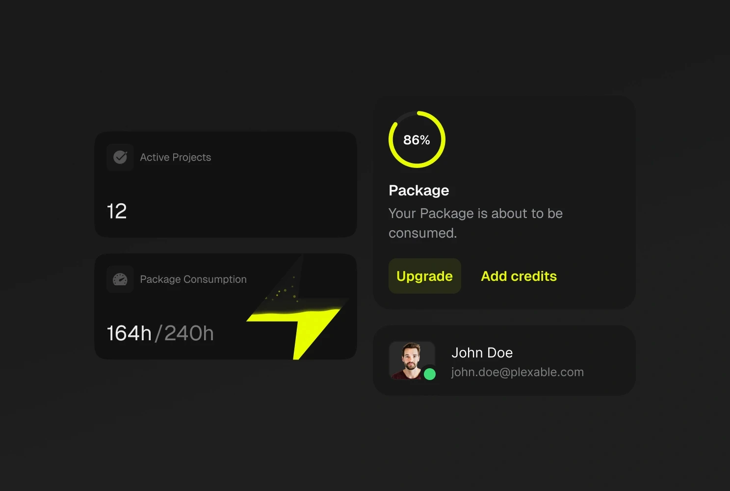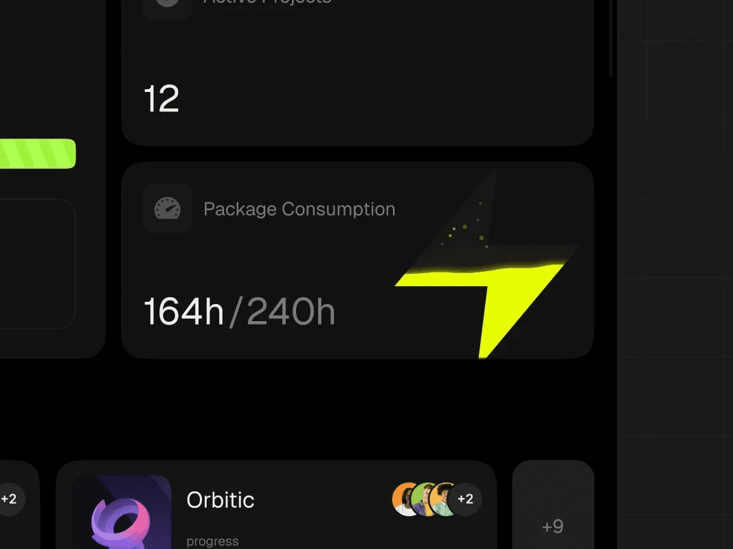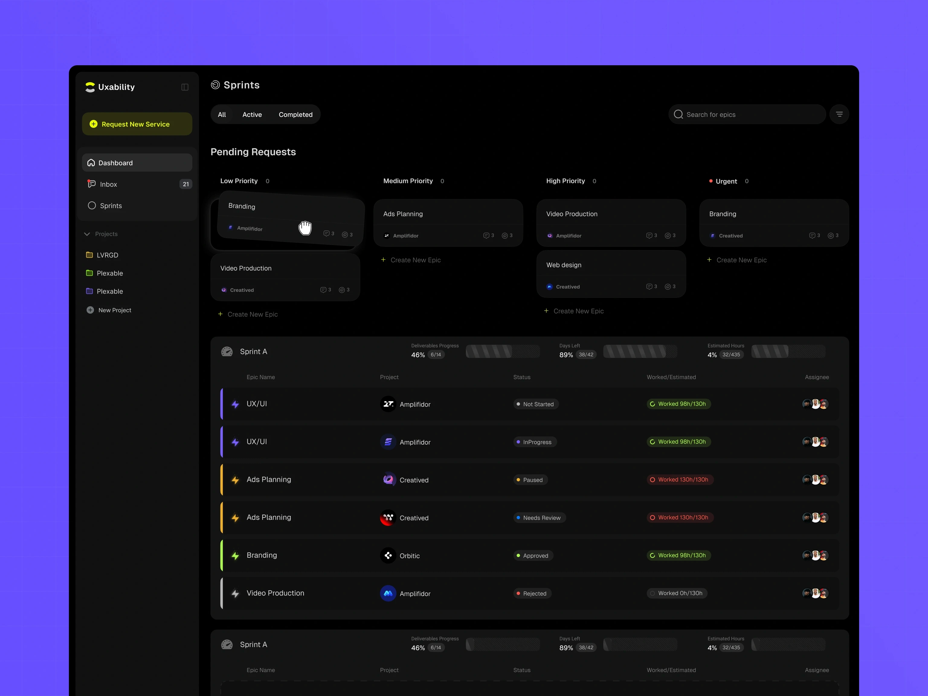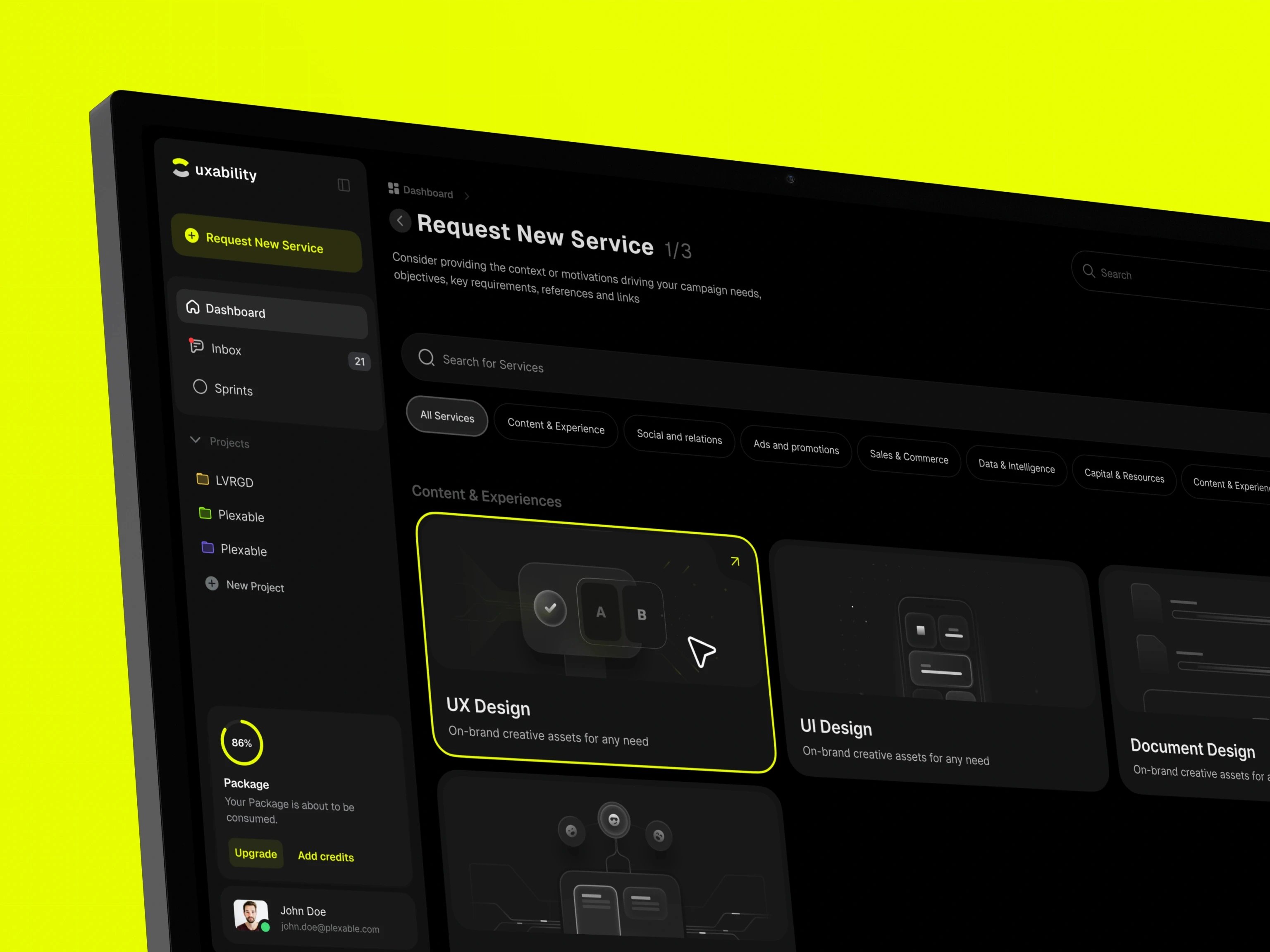 High-contrast "Dark Mode" components ensure focus on active tasks. Clean geometry and vibrant accents reflect the "Productized Service" identity crucial for the Uxability experience.