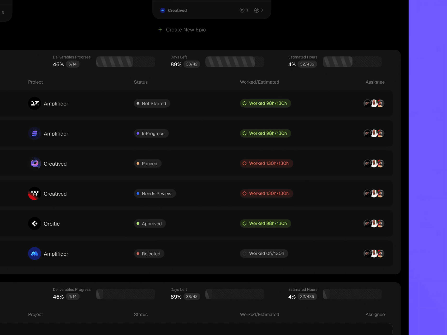 Creative teams and clients struggled with fragmented communication and inconsistent project visibility. Real-time updates on design sprints were either missing or buried in emails. Without a single source of truth, teams wasted 30% of their capacity switching tools and manually tracking hours.