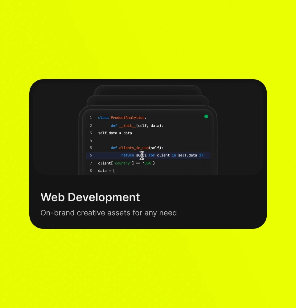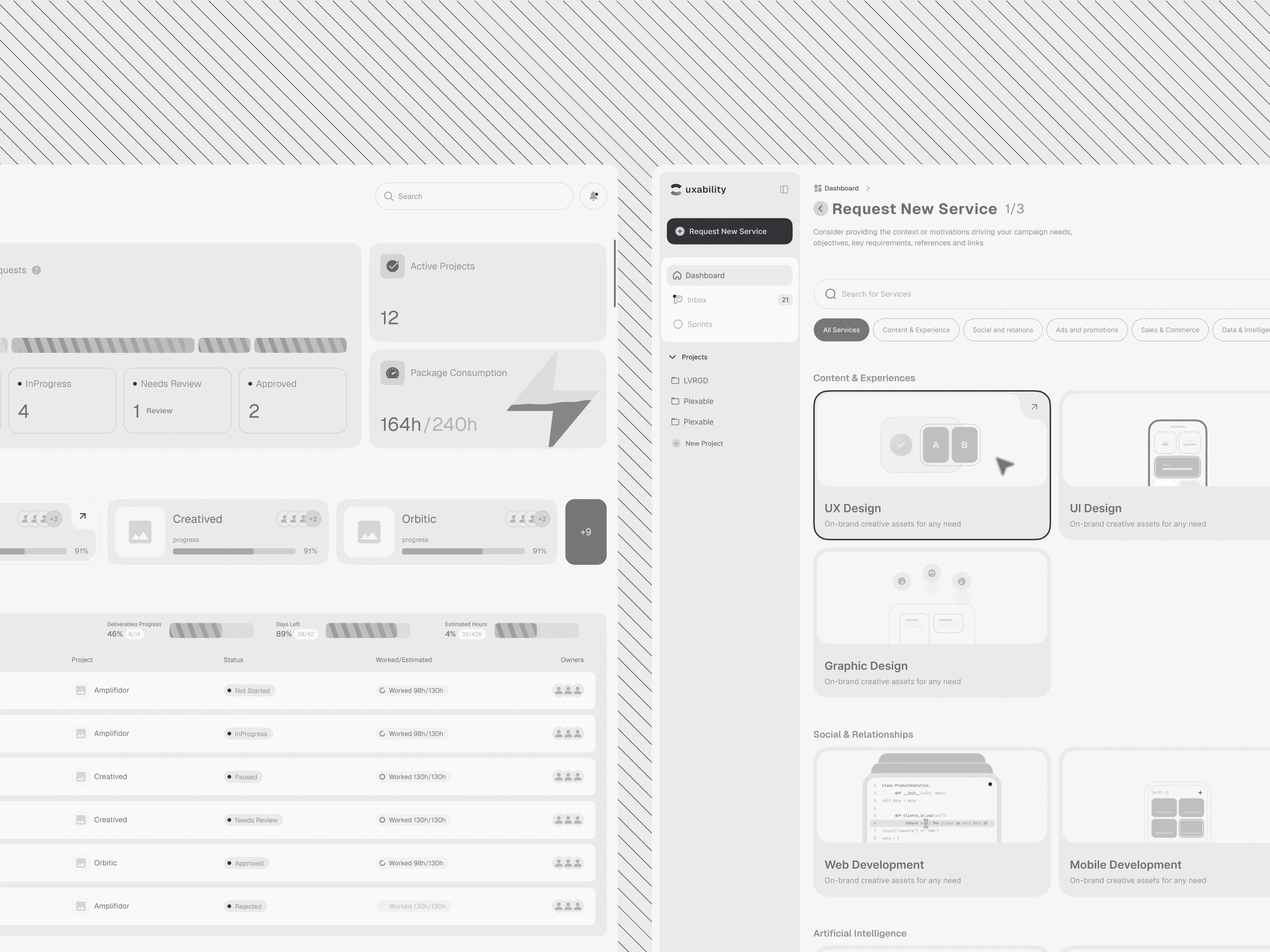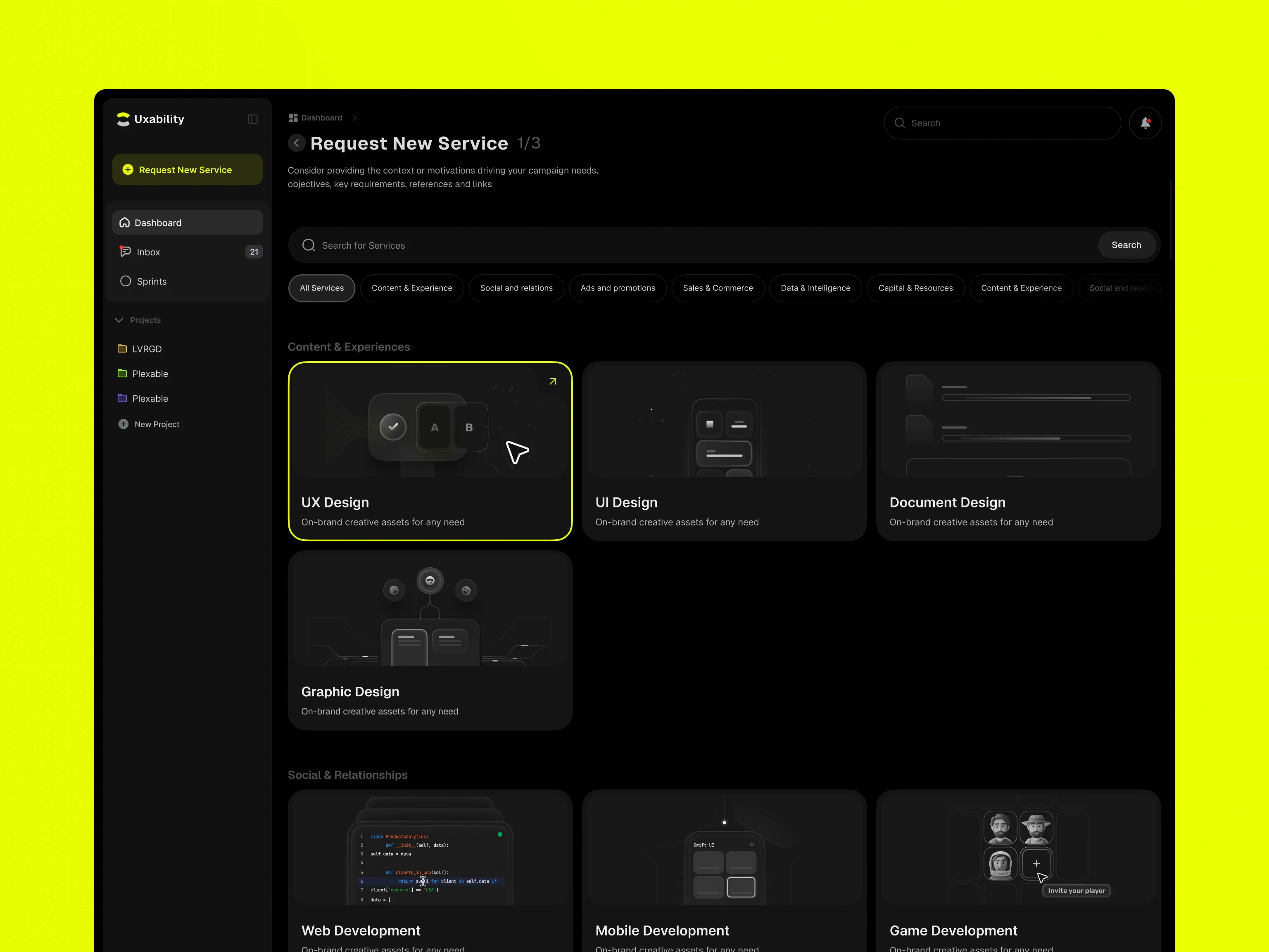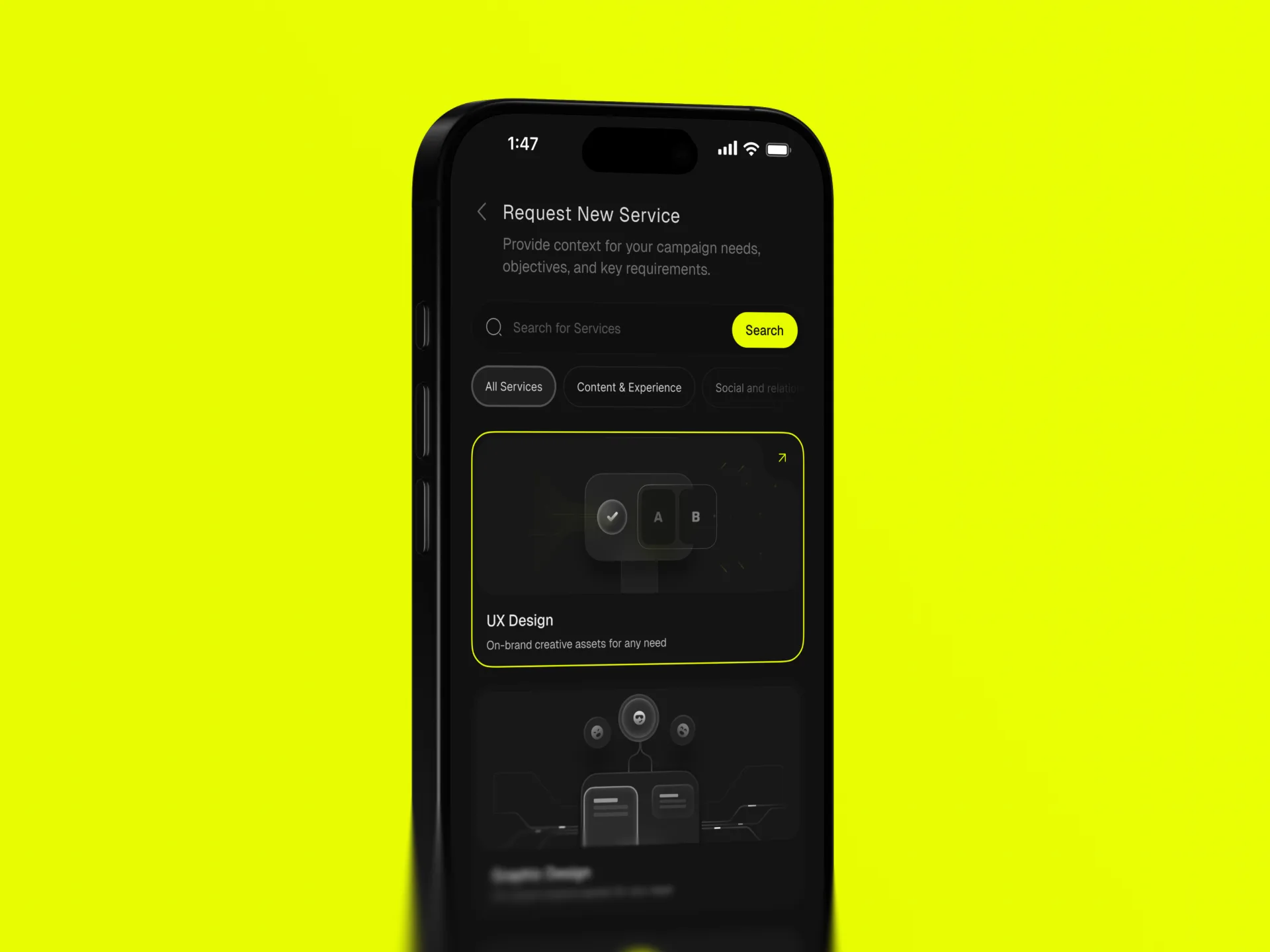A modular screen that enables users to browse and request specific design or development services (UX/UI, Graphics, Apps) effortlessly.