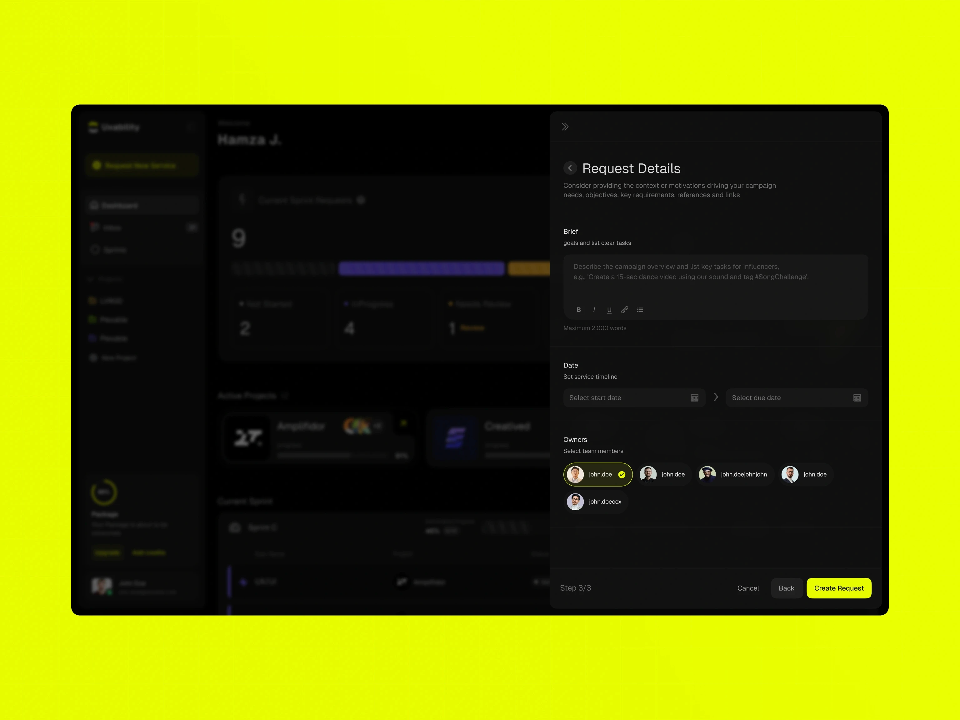 A new "Request New Service" flow improves visibility into available design/dev modules. Users can now launch new initiatives in just a few clicks.